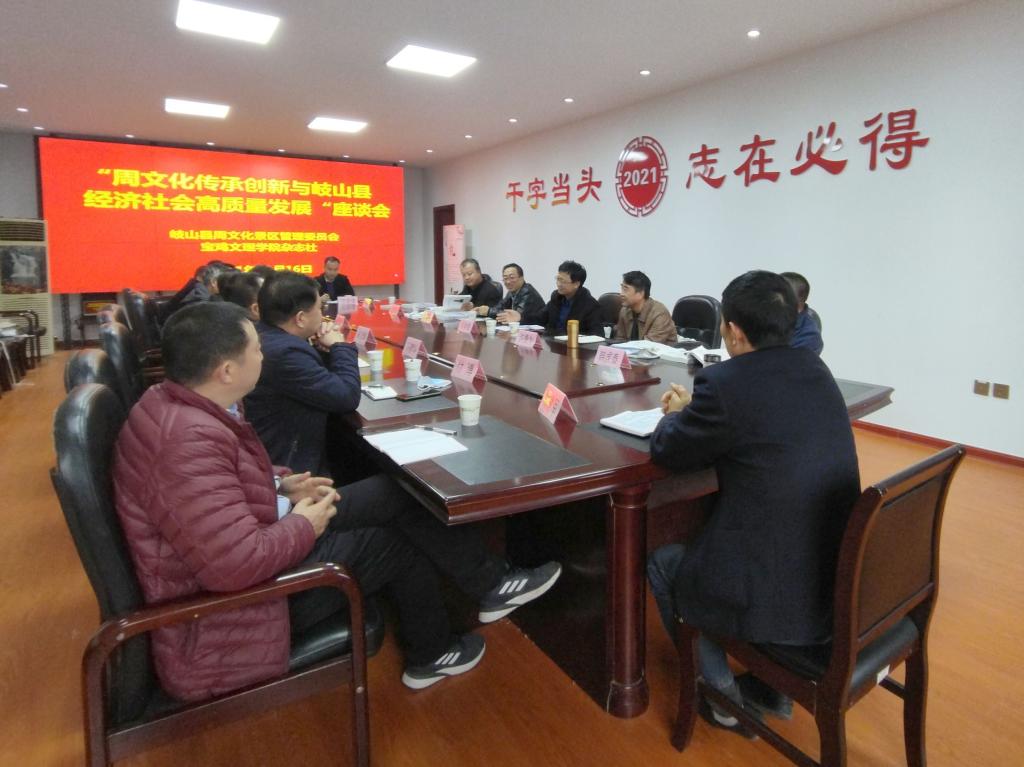 beat365杂志社办公室主任马亚利,学报社科副主编张福安,马克思主义学院许勇为博士,政法学院韩虎泰博士,历史与旅游管理学院赵建昌副教授,岐山县周文化景区管委会党政办公室主任贺建锋,岐山县文旅局党委委员、广播电视台台长冯建科,岐山县文旅局党委委员、文化馆馆长付博,岐山县周原博物馆馆长徐建军,周文化研究会副会长马庆伟、邵宏涛,周文化研究会秘书长王刚等参加了座谈会。(杂志社 文/图/马亚利、贺建锋 审核/刘林魁)