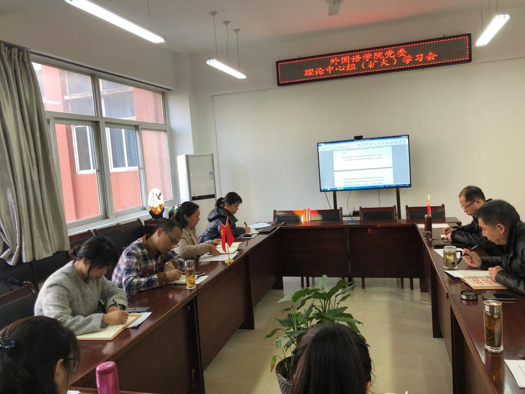 11月19日上午,外国语学院召开党委理论学习中心组(扩大)学习会,专题学习十九届六中全会精神。学院党委理论学习中心组成员、党支部书记、科级干部、辅导员等参加了学习会,会议由学院党委书记官莉萍主持。