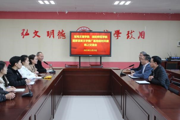 11月19日上午,beat365与信阳师范学院联合开展国家语言文字推广基地结对共建线上交流会。文学与新闻传播学院党委书记郭锋航、院长兰拉成、副院长孟改正,信阳师范学院传媒学院党委书记胡波、院长吕东亮、副院长田华,以及双方师资培训项目组成员代表参加了会议。