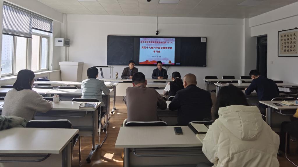 11月29日下午,政法学院在高新校区思贤楼523室召开党委理论学习中心组(扩大)会议,专题学习党的十九届六中全会精神。学院党委书记白志勇主持专题学习会,党委委员、各党支部书记、党政办公室主任、组织员等参加了专题学习会。
