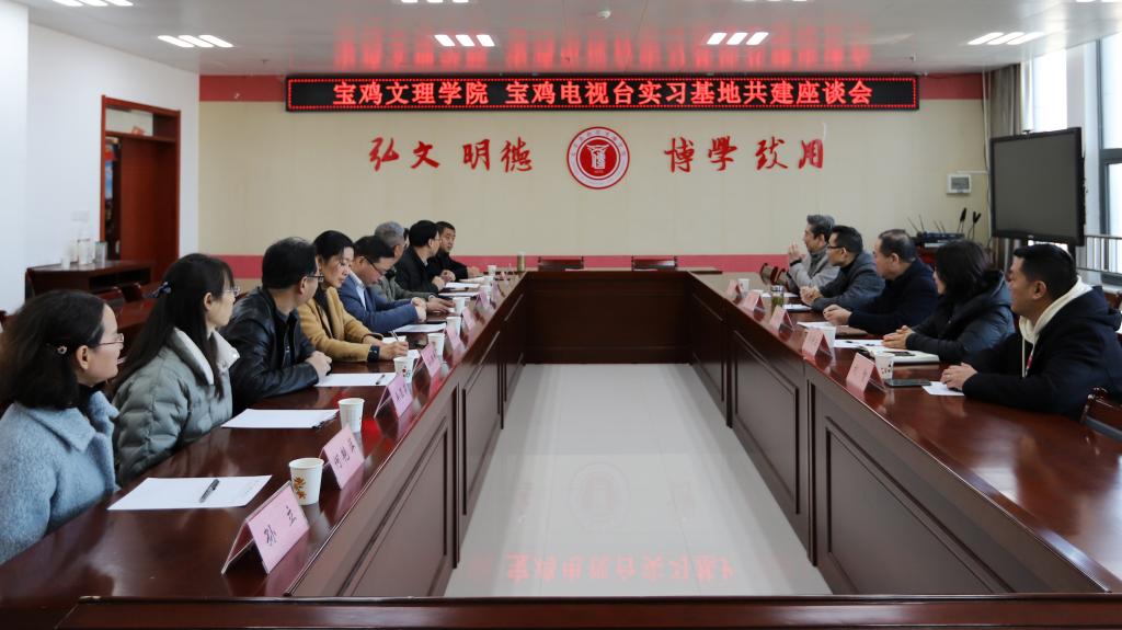 12月2日上午,宝鸡电视台总编辑郭国利、总编办主任张攀、社会新闻部主任王昆、人力资源部主任李静云、传媒营销策划有限公司副总经理刘智等一行五人来beat365文学与新闻传播学院调研交流传媒人才培养与合作共建工作,双方在高新校区博文楼1401会议室召开实习基地共建座谈会。会议由文学与新闻传播学院副院长孟改正教授主持。学院班子成员和传媒专业部分教师参加了座谈会。