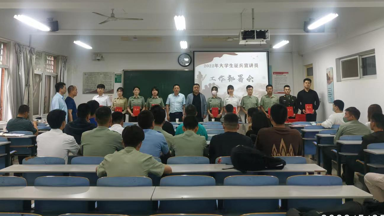 5月25日下午,校武装部在高新校区思贤楼124教室举行2022年大学生征兵宣讲员工作部署会。武装部部长李迪、宝鸡军分区渭滨区人武部军事科科长屈榕为大学生征兵宣讲员颁发聘书。会议由保卫处副处长陈正社主持。