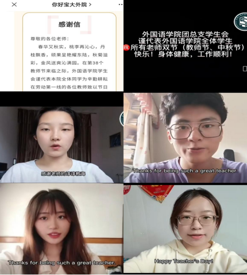 学院团总支学生会举行“教诲如春风,师恩深似海”感恩·教师节线上送祝福活动,同学们将祝福以视频形式送给老师,感谢老师的辛苦培育和悉心呵护,感恩老师为他们的成长保驾护航!同时,开展了线上“最美笔记”展示活动,以此感谢老师在疫情防控下坚守教书育人岗位!(外国语学院 文、图/韩磊、王宁 审核/官莉萍)