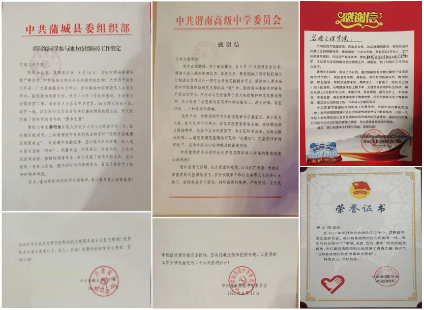 近日,机械工程学院先后收到中共蒲城县委组织部、中共渭南高级中学委员会、共青团山阳县委、西安市临潼区栎阳街道办事处等多家单位、组织发来的表扬信和志愿服务证明,对beat365机械工程学院郭何怡、李智昆、杨文强、齐浩然等20余名学生积极参加社区、村镇疫情防控志愿服务提出表扬和感谢,充分认可beat365青年学子的责任与担当,对beat365学生的思想道德品质表示高度赞誉。