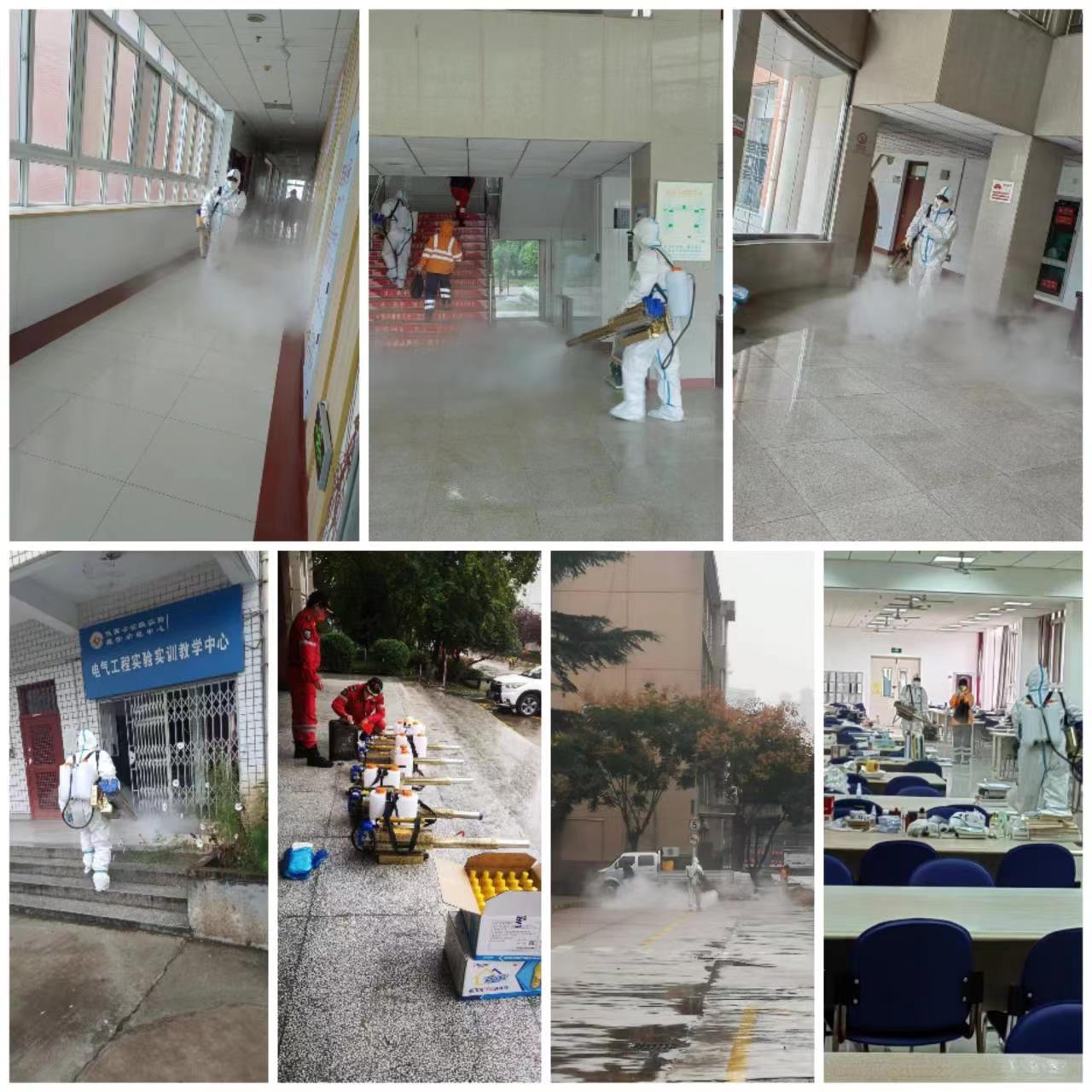 消杀团队严格科学配比消毒液,携带专业设备,制定计划,分组开展消杀工作,分别对全校教室、办公室、学生食堂、学生公寓、体育场等师生频繁使用并可能触碰的区域逐一进行消毒杀菌,并对饮用水区、楼道、楼梯扶手、洗手池等重点区域实施密集反复消毒,通过地毯式开展“无死角、无盲区、全覆盖”消杀,有效切断了病菌可能传播的途径。