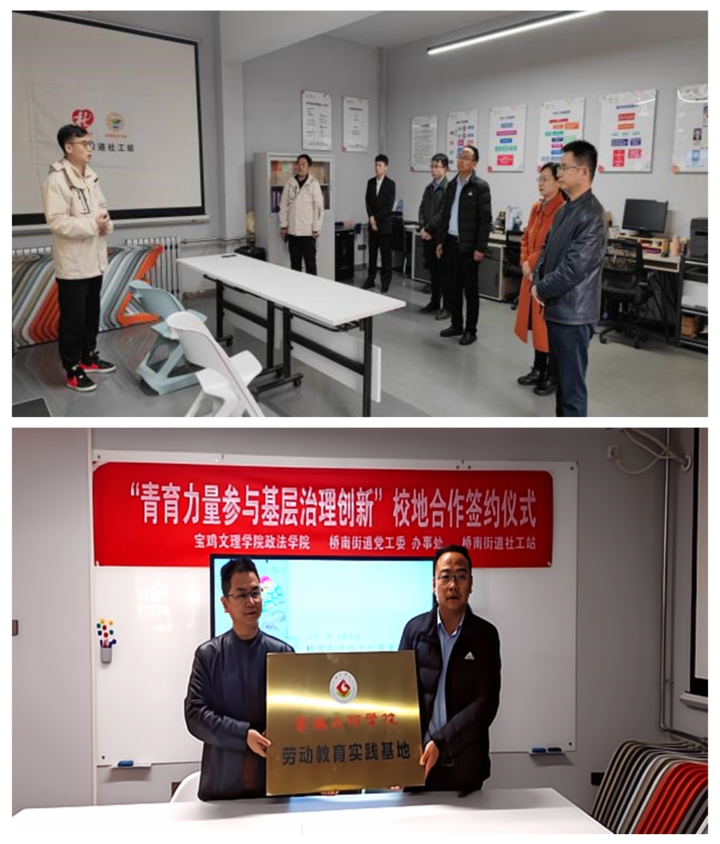 3月23日下午,政法学院与宝鸡市桥南街道办事处共建“劳动教育实践基地”签约授牌仪式在桥南社工站举行。政法学院院长张波、副院长范林,桥南街道办主任陈峰、桥南社工站副站长黄磊及beat365部分学生代表参加仪式。