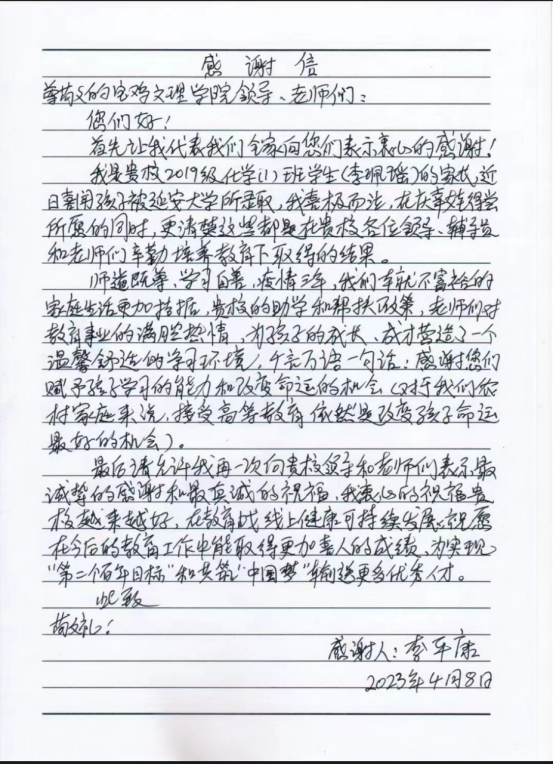 李佩瑶被延安大学拟录取为2023级硕士研究生。李佩瑶的家长表示,孩子得偿所愿,是“贵校各位领导、辅导员和老师们辛勤培养教育下取得的结果”。疫情三年,是学校的助学和帮扶政策,老师们对教育事业的满腔热情,为孩子的成长成才营造了一个温馨舒适的学习环境,“千言万语一句话:感谢您们赋予孩子学习的能力和改变命运的机会”。家长“衷心地祝福贵校越来越好,在教育战线上健康可持续发展,祝愿在今后的教育工作中取得更加喜人的成绩,为实现‘第二个百年目标’和共筑‘中国梦’输送更多优秀人才。”