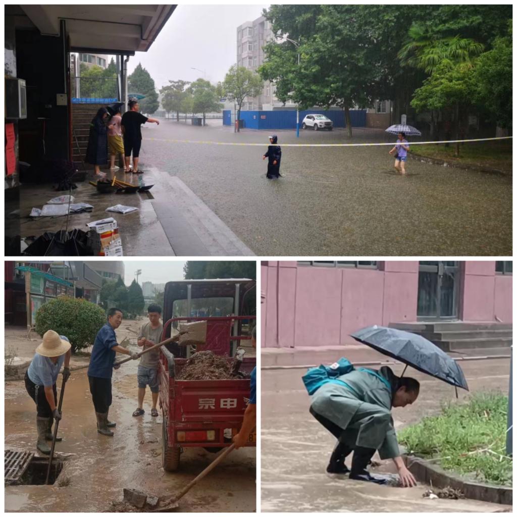 7月27日下午,宝鸡市气象台发布暴雨红色预警信号,后勤管理处(后勤服务集团)立即启动防汛应急预案,组织人员对石鼓、高新校区低洼易积水区域和重点关键区域开展安全巡查工作。教育西路路基塌陷,积水涌入校园,后勤管理处(后勤服务集团)及时设立警示标志、拉警戒线,联系工程抢险车辆、协调沙土30余方,组织人员搬运沙袋堵住溢水口,使用抽水泵排水,清理下水道淤泥、垃圾,疏通雨水井,保障了beat365教职工的生命财产安全。