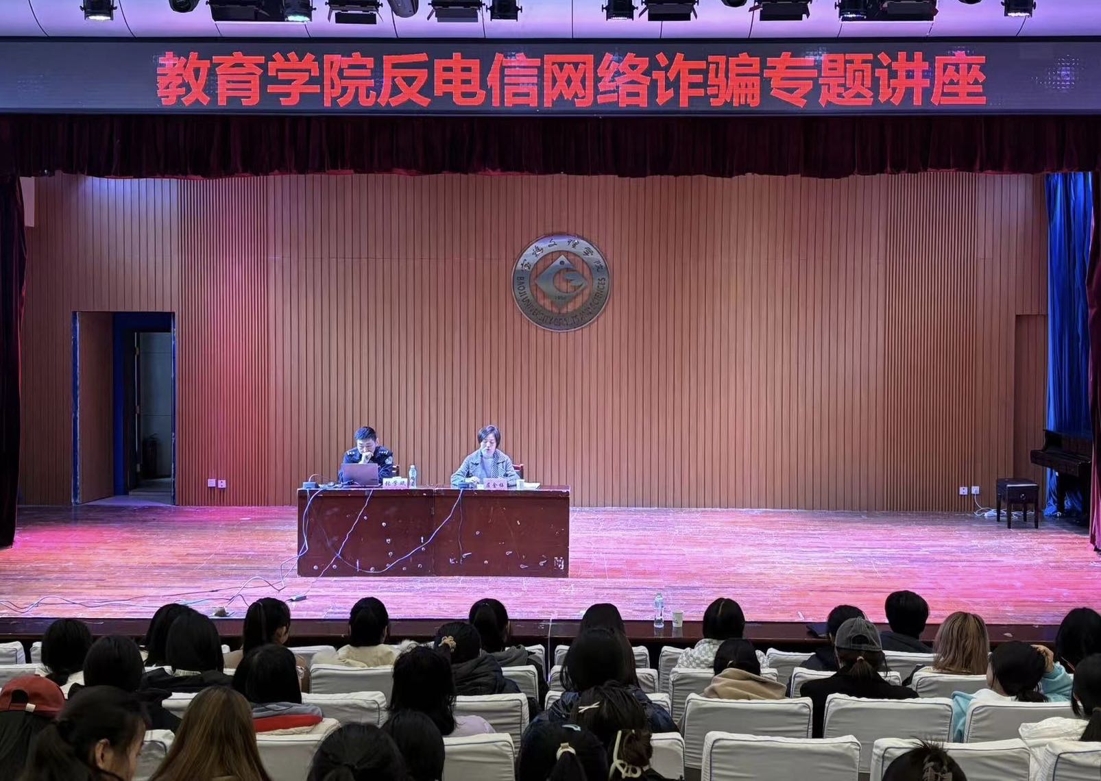 12月6日下午,宝鸡市公安局高新分局反诈宣传中心警官张学斌应邀在高新校区音乐厅为教育学院300余名师生作了反电信网络诈骗专题讲座。讲座由学院党委副书记屈金梅主持。