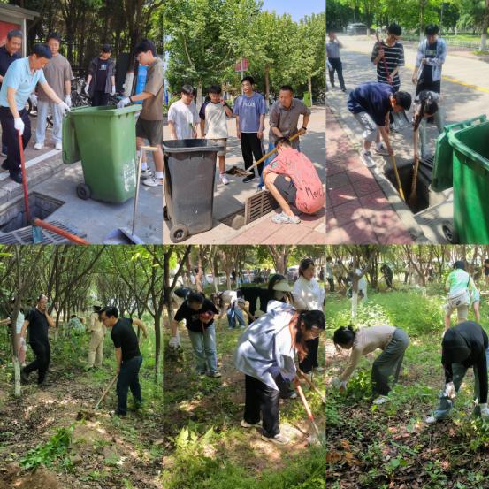 劳动现场,师生党员们热情高涨、踊跃参加,大家对高新校区园林内的绿化树木进行了修剪、野草杂树进行了铲除,浅坑沟渠进行了平整,校园主干道下水道里的垃圾和污泥进行了全面清理,为夏季暴雨时能及时排水提前做好防范准备工作。师生党员分工负责、团结协作,用实际行动诠释了吃苦在前、勇于担当的良好精神风貌。
