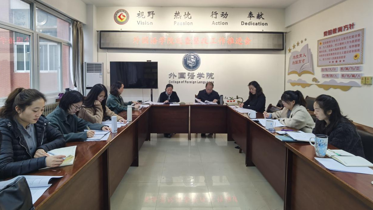 学院党政领导、党委委员、党支部书记、系部主任、党政办公室人员20余人参加会议。(外国语学院 文、图/王阿莉 审核/官莉萍)