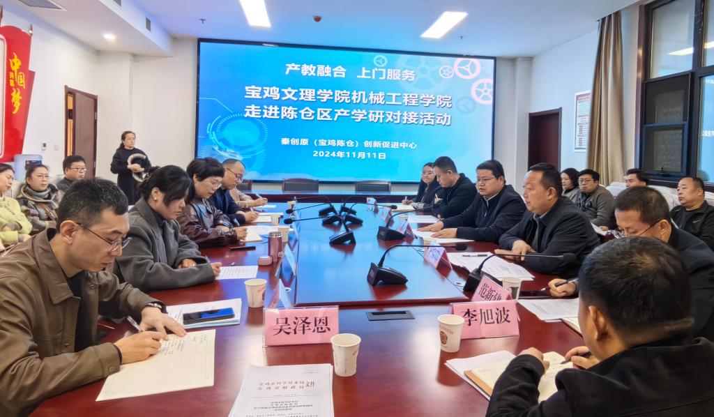 11月11日,机械工程学院开展“走进陈仓区 对接产学研”暨访企拓岗活动。座谈会在宝鸡市陈仓区工信(科技)局会议室召开,宝鸡市陈仓区工信(科技)局副局长范新建主持会议。