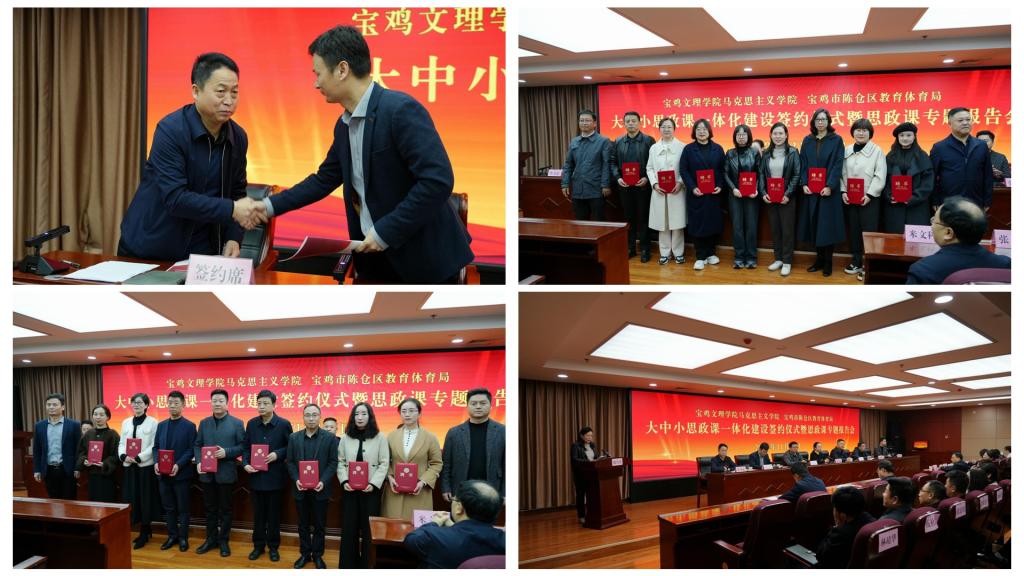 11月15日,马克思主义学院与陈仓区教育体育局在陈仓区教体局二楼会议室举行大中小思政课一体化建设签约仪式暨思政课专题报告会。副校长凡明锦,陈仓区委副书记、区委教育工作领导小组组长柳鹏举出席签约仪式并讲话。马克思主义学院党总支书记张选朝、院长刘晓勇,陈仓区区委常委、宣传部部长徐宏刚,陈仓区教体局党组书记、局长李卫东参加签约仪式。陈仓区政府副区长齐晓辉主持签约仪式。