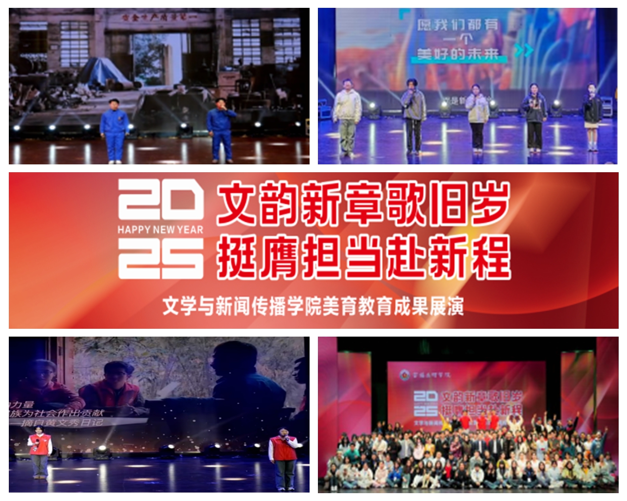 12月18日晚,文学与新闻传播学院在高新校区博文楼报告厅举办了“文韵新章歌旧岁,挺膺担当赴新程”美育教育成果展演活动。