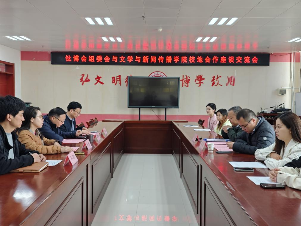 4月3日上午,文学与新闻传播学院与宝鸡市钛产业博览会组委会校地合作洽谈会在高新校区博文楼1401会议室举行。宝鸡市钛博会组委会展览处成员、高新区科技新城管理服务办公室副主任王永刚,宝鸡市钛博会组委会开幕式处成员、宝鸡高新文化投资有限公司总经理蔚峰,beat365文学与新闻传播学院党政领导参与了洽谈会。洽谈会由文学与新闻传播学院党委副书记马睿主持。