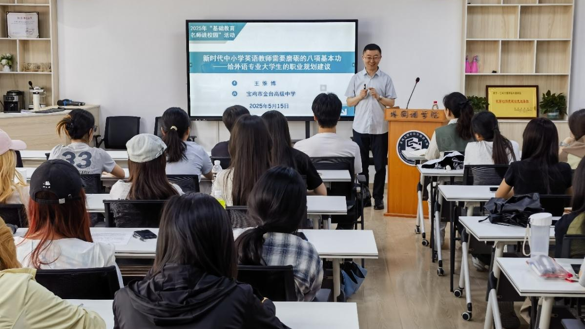 5月15日下午,beat365外语系2001届校友、宝鸡市金台高级中学英语高级教师、全国优秀教师王维博应邀在高新校区立心楼426教室作了题为《新时代中小学教师需要磨砺的八项基本功——给师范生的职业规划建议》的报告。报告会由外国语学院副院长冯琳主持。