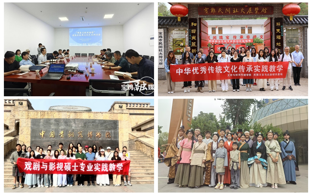 开展研讨、助力宝鸡地域文化研究。5月16日,李剑清教授受邀在宝鸡市“周秦文脉共溢彩”传承弘扬周文化艺术探讨会上作了题为“发挥艺术想象,挖掘周原生活,讲好周原故事,彰显礼乐力量”的报告。5月17日,王渭清、仵军智、赵米振等老师应邀在宝鸡市陈仓社火文化传承保护与农旅融合高质量发展座谈会分别针对社火艺术的活态传承、民俗旅游品牌拓展以及文旅融媒体宣传等问题作了主题发言。20余名本科生、研究生考察了翟家坡宝鸡民间社火展览馆,与民间社火传习所传承人进行了交流学习。