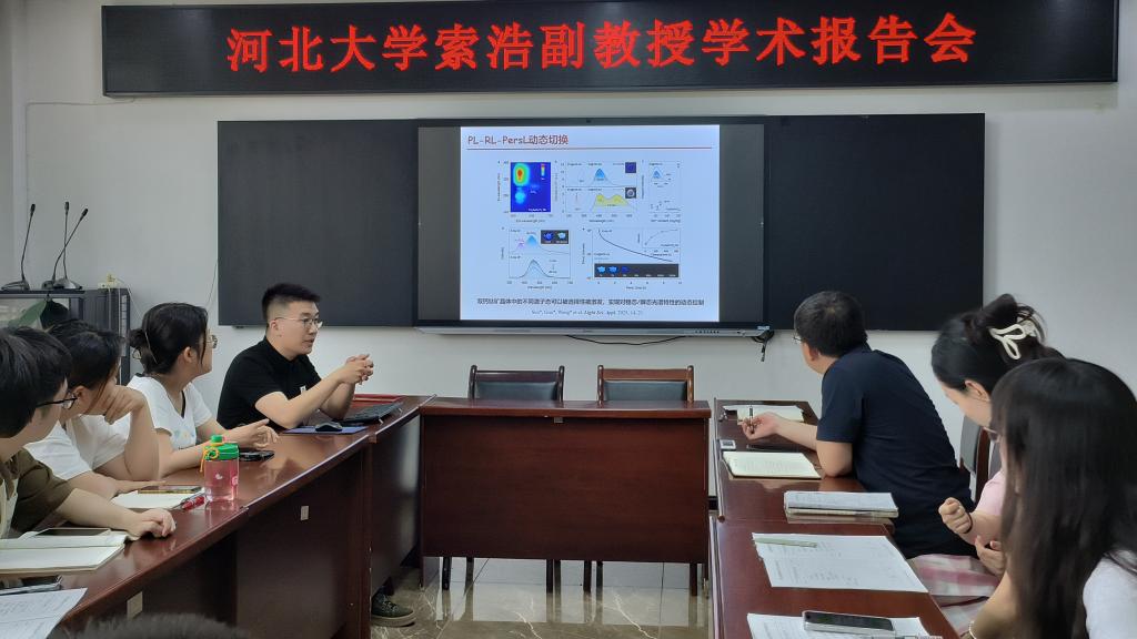索浩结合本人在光-热-力刺激响应型稀土/过渡金属离子掺杂智能发光材料的相关研究工作,从基于声子辅助能量传递、晶格负热膨胀、表面配体调控等策略的荧光热增强机制研究和性能优化,探究热增强发光对荧光比率测温性能的优化机制,以及自恢复型应力发光纳米材料的设计合成和光谱调控,新型应力发光光源在自供能无损检测方面的应用前景等两个方面进行了深入的讲解。报告结束后,索浩与到场师生进行了深入的沟通与交流,并详细解答了现场提出的问题。