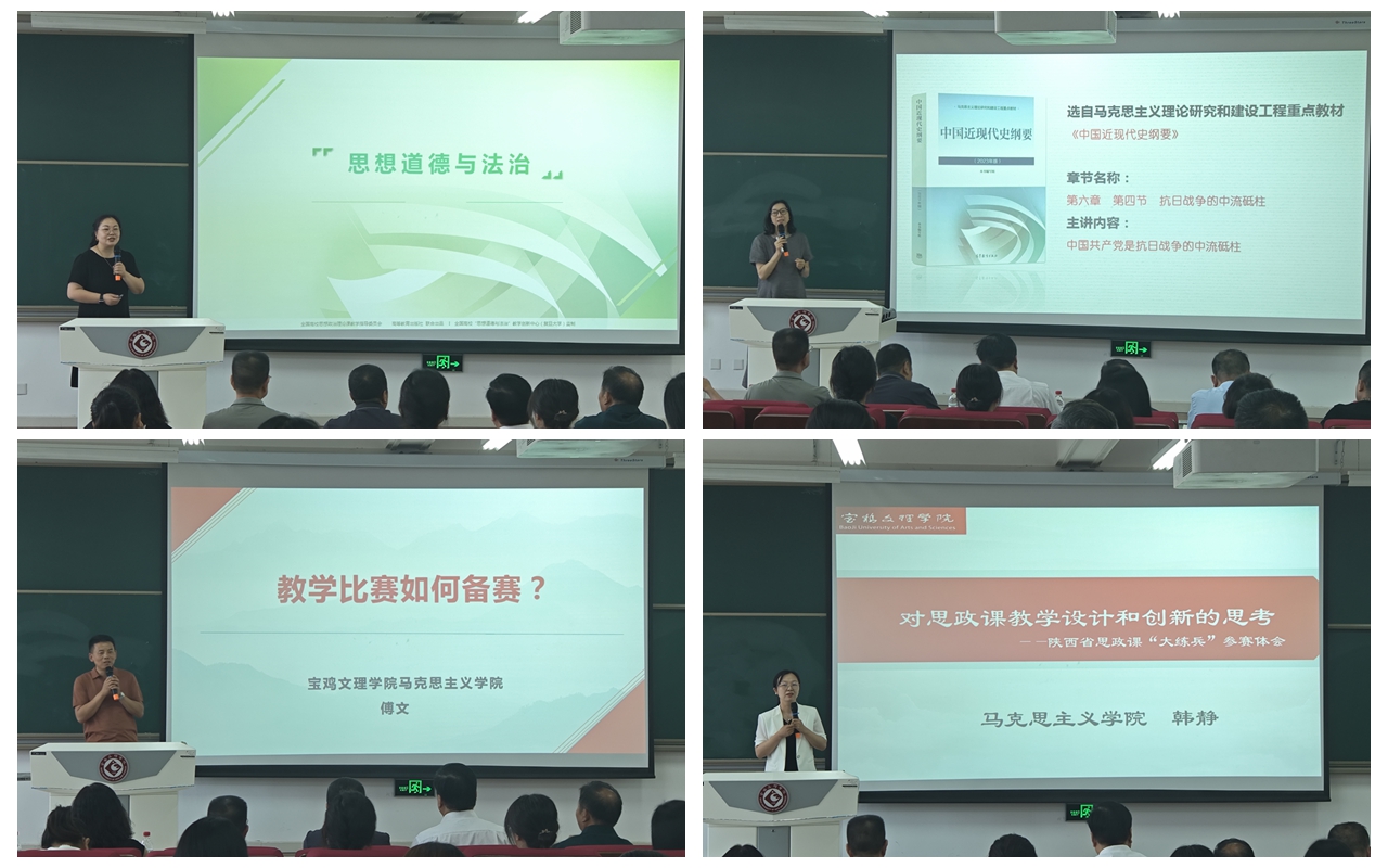在专题培训环节,陕西省本科高校教师教学创新大赛一等奖获得者、陕西高校思政课教师“大练兵”省级展示活动“教学能手”、形势与政策教研室主任傅文和陕西省本科高校教师教学创新大赛二等奖获得者、陕西高校思政课教师“大练兵”省级展示活动“教学标兵”、马克思主义基本原理教研室主任韩静结合自身参赛经历,分别以“教学比赛如何备赛”和“对思政课教学设计和创新的思考”为题作了经验分享,为教师们提升教学水平、打磨优质课程提供了参考。