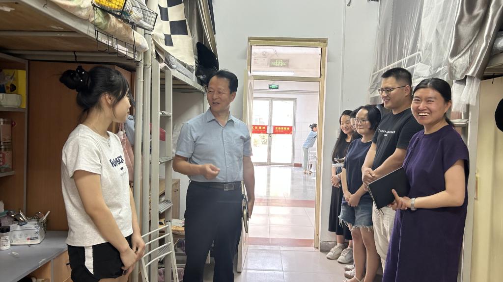 在学生公寓,于建伟与学生亲切交流,全面了解学生思想动态、学习情况、生活需求。针对专业学习、生涯规划、深造去向等具体问题给予学生指导,鼓励同学们积极面对挑战,合理规划未来发展方向,刻苦学习,练就过硬本领。