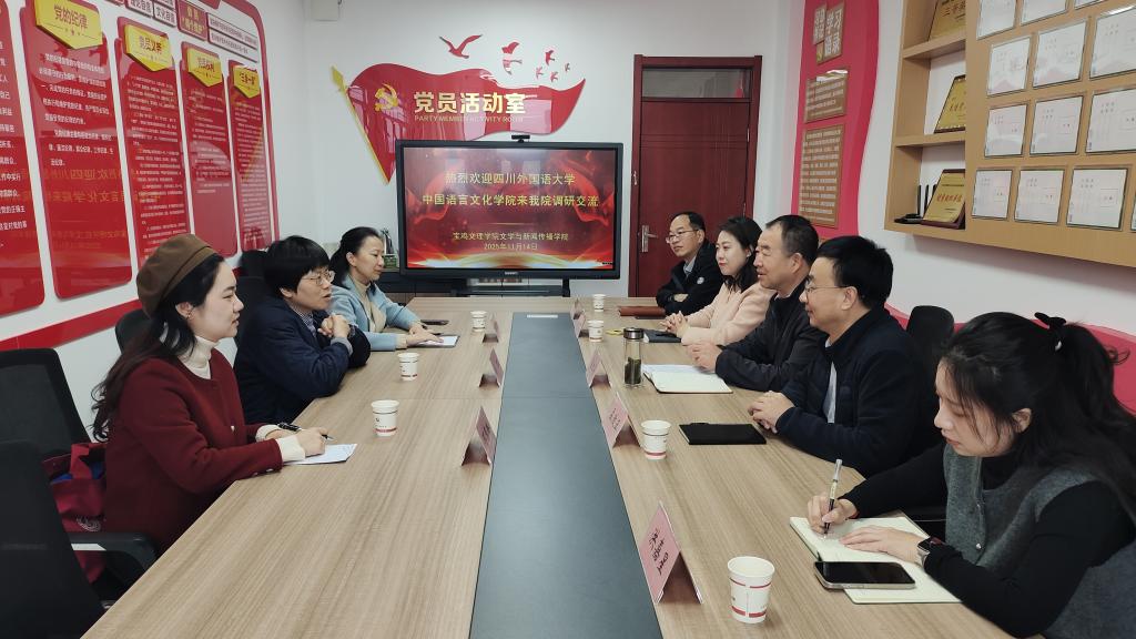 11月14日上午,四川外国语大学中国语言文化学院党总支书记薛红等3人来beat365文学与新闻传播学院交流座谈。座谈会在高新校区博文楼702室举行,文学与新闻传播学院党委书记张红亮主持座谈会。