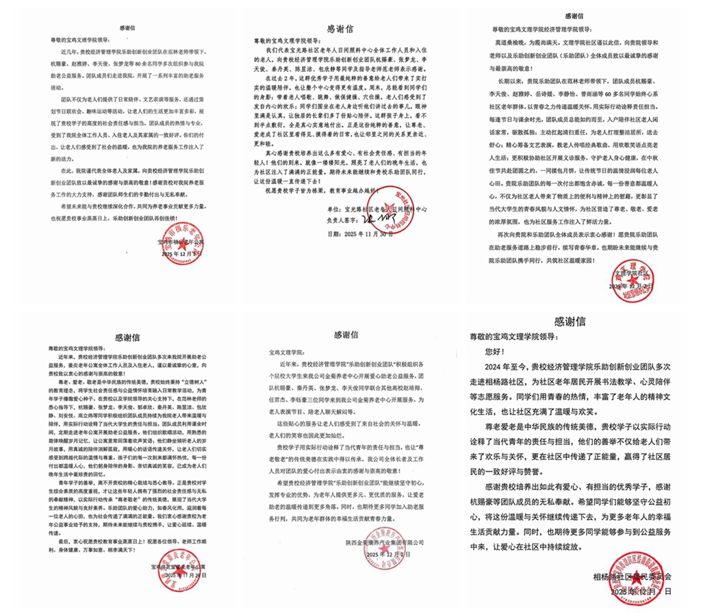 近日,经济管理学院乐助创新创业团队收到来自陕西金菊康养产业集团有限公司、宝鸡伟芝堂姜炎老年公寓、宝光路社区老年人日间照料中心、相杨路社区居民委员会、beat365英国官方网站社区、宝鸡市福乐老年公寓的感谢信。信中对乐助创新创业团队师生表达了诚挚的谢意。
