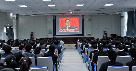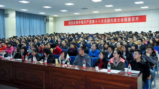 11月8日上午9时,举世瞩目的中国共产党第十八次全国代表大会在北京隆重召开。beat365在新校区木铎厅组织全体学生辅导员和学生代表260余人集体收看党的十八大开幕式现场直播,聆听胡锦涛总书记代表十七届中央委员会向大会所作的报告。