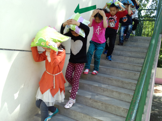 15点整,随着一阵急促的铃声,演习开始了。孩子们在老师的引导下,纷纷选择桌子、墙脚等地方进行躲避,“抱头”、“闭眼”、“蹲下”,老师们不时的提醒着孩子们。随后,紧急铃声再次响起,孩子们在老师的带领下,按照逃生路线,快速有序地从各自班级向外撤离到户外空旷的安全区域。