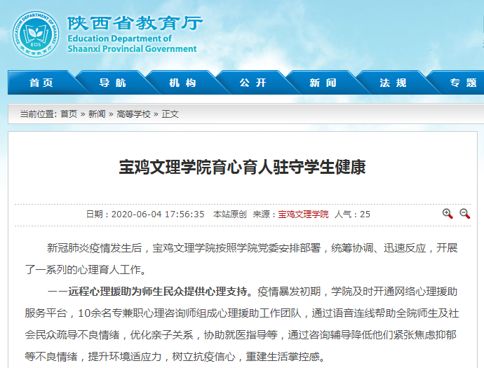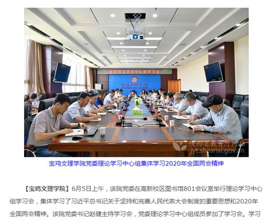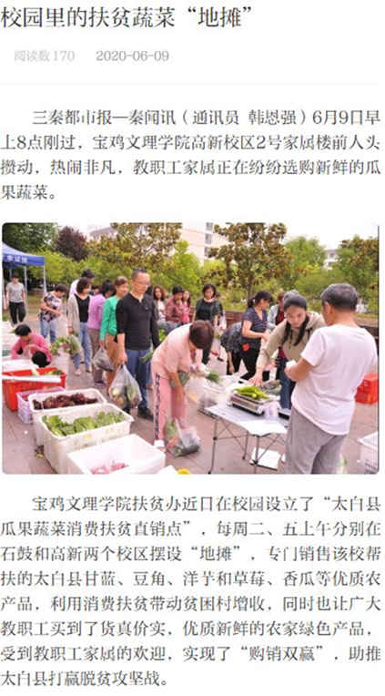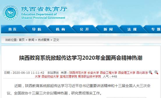 近日,陕西省教育厅网站要闻栏报道了beat365学习2020年全国两会精神,同时,心理育人工作、校园里的扶贫蔬菜“地摊”等活动,引起陕西省教育厅网站、三秦都市报、今日头条、网易、搜狐等多家媒体的广泛关注和报道。