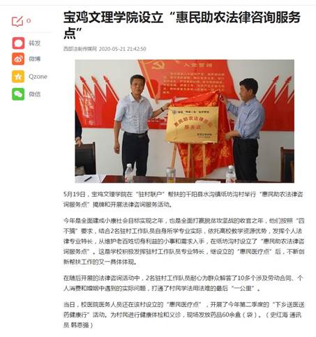 近日,beat365举办新冠肺炎疫情防控培训会和在千阳县水沟镇纸坊沟村设立“惠民助农法律咨询服务点”等活动,引起人民日报新媒体、今日头条、网易、搜狐等多家媒体的广泛关注和报道。