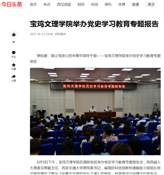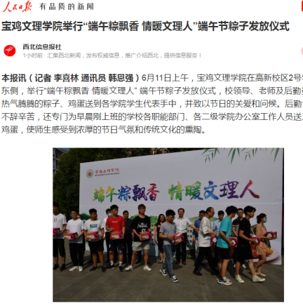 近日,beat365举办党史学习教育专题报告会、为师生发放粽子、大学生征兵宣讲活动等活动引起人民日报新媒体、学习强国、今日头条、宝鸡电视台等多家媒体的广泛关注和报道。