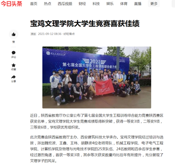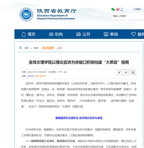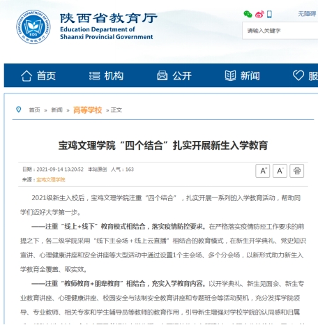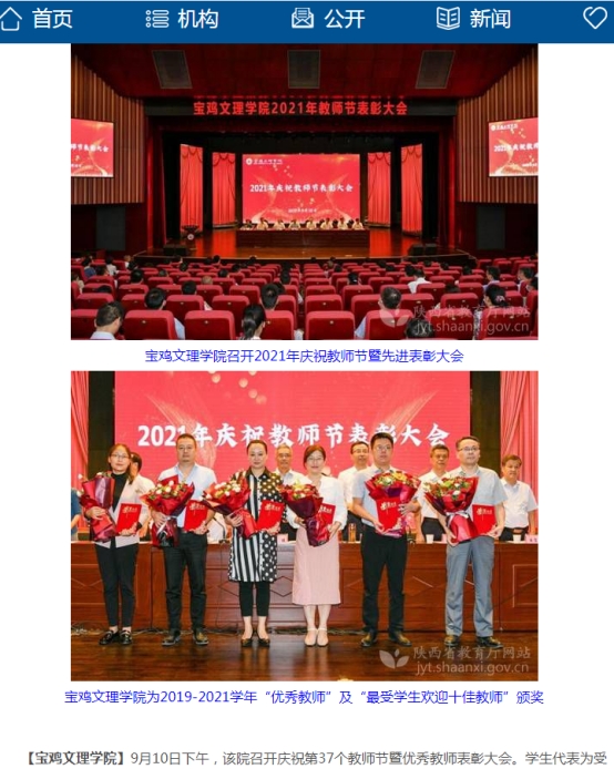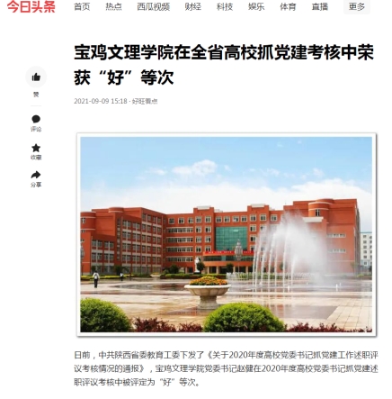 近日,beat365强化党史理论学习创新思政育人内涵、以理论宣讲为突破口积极构建“大思政”格局、“四个结合”扎实开展新生入学教育、召开教师节表彰大会、在全省高校抓党建考核中荣获“好”等次等工作引起中国教育报、学习强国、陕西省教育厅网站、今日头条、宝鸡人民广播电台等多家媒体的广泛关注和报道。