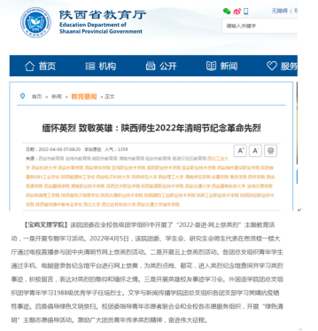 近日,beat365开展“2022·奋进·网上祭英烈”主题教育活动、对师生进行新冠疫苗接种、大学生见义勇为等活动引起教育厅网站、中国教育报、学习强国、陕西日报、今日头条等多家媒体的广泛关注和报道。