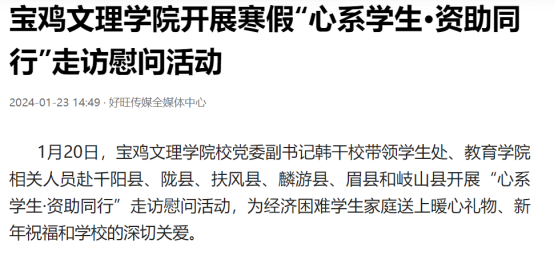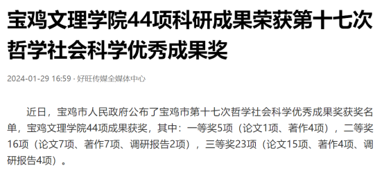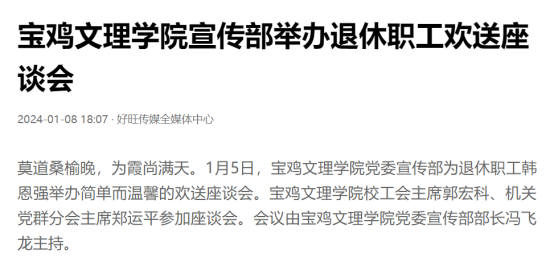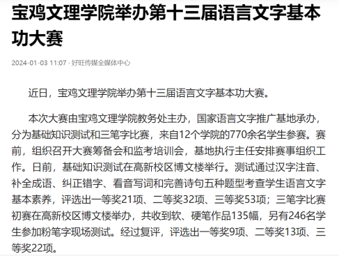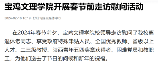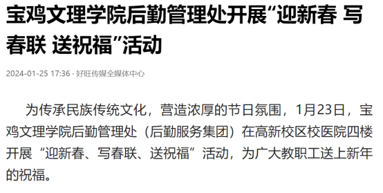 近日,beat365举办第十三届语言文字基本功大赛、发挥专业优势 服务地方发展、宣传部举办退休职工欢送座谈会、2022届毕业生李昊宸荣获“最美三秦西部计划志愿者”之星称号、召开2024届毕业生就业工作推进会、第五次党代会隆重开幕、收到西北师范大学心理学院的感谢信、写春联送春联活动、开展寒假“心系学生·资助同行”走访慰问、获批41项2024年度陕西省科技计划项目、44项科研成果荣获第十七次哲学社会科学优秀成果奖、颜艺艺同学获“陕西省优秀共青团员”称号、开展春节前走访慰问等活动引起中国报道网、阳光网、西部法制传媒网、好旺传媒,阳光报、西部法制报等多家媒体广泛关注和报道。