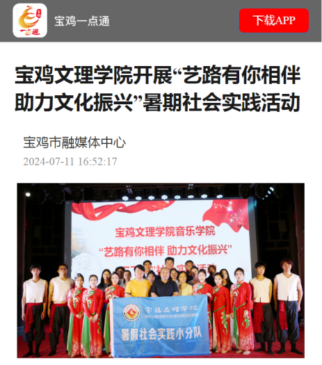 近日,学校举行庆祝中国共产党成立103周年暨“七一”表彰大会、代表团前往马来西亚和新加坡开展校际合作交流、举行2024年大学生暑期文化科技卫生“三下乡”社会实践活动出征仪式、与宝鸡市础石金属检测有限责任公司签订校企合作战略协议、宝鸡市低空智能飞行研究院揭牌成立、大学生青铜器志愿讲解团队获青年志愿服务项目赛铜奖、开展“美丽中国 青春行动”专项暑期社会实践活动、组织师生赴茵香河文化旅游区开展暑期社会实践活动、开展“艺路有你相伴 助力文化振兴”暑期社会实践活动、前往陇县开展实践调研活动、“青禾硕果”乡村振兴社会实践团开展实践活动等引起陕西省教育厅-新闻-热点聚焦、中国周刊网、阳光报、阳光网、陕西科技传媒网、宝鸡一点通-宝鸡市融媒体中心等多家媒体广泛关注和报道。