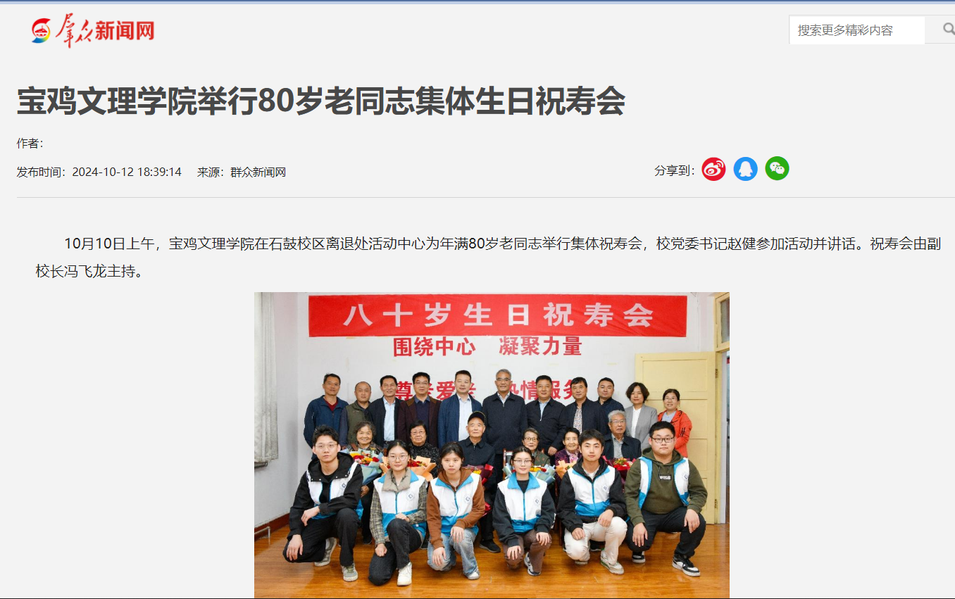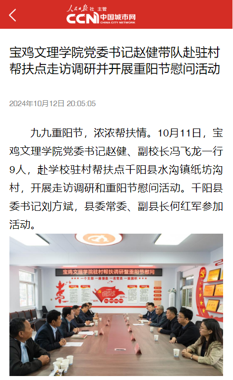 近日,校领导带队赴驻村帮扶点走访调研并开展重阳节慰问活动,赴太白县调研“双百工程”工作并开展金秋送暖慰问帮扶活动,学校举行80岁老同志集体生日祝寿会,学校举办教师教学创新大赛,学校赴南京大学参加招才引智专场活动,机关党委开展“赓续红色血脉 助力教育强国”党日活动,beat365学子走进环卫终端开展研学活动,美术学院开展“妙手绘石墩 指尖‘画’团结”等活动引起人民日报社、人民日报全媒体、阳光网、西部法制报、群众新闻网、起点新闻、今日头条等多家媒体广泛关注和报道。