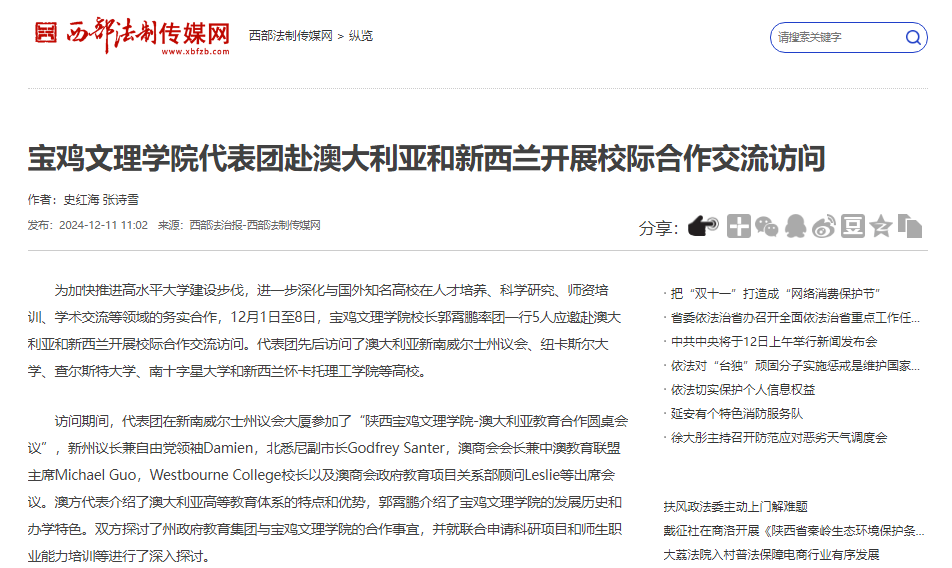 近日,宝鸡市委书记杨广亭为beat365师生讲授思政课,宝鸡市产教融合企业“院校行”活动在beat365举行,学校代表团赴澳大利亚和新西兰开展校际合作交流访问,开展第二期“书记·校长有约”午餐会活动,举办就业工作人员职业规划与就业指导能力提升培训班等活动引起学习强国、西部法制传媒网、三秦都市报、群众新闻网、民生网、城市金融网、陕西科技传媒网、今日头条等多家媒体广泛关注和报道。