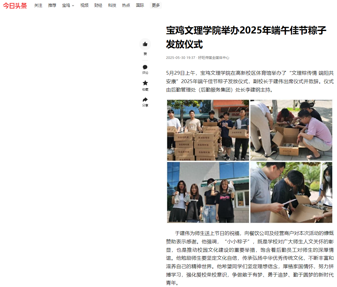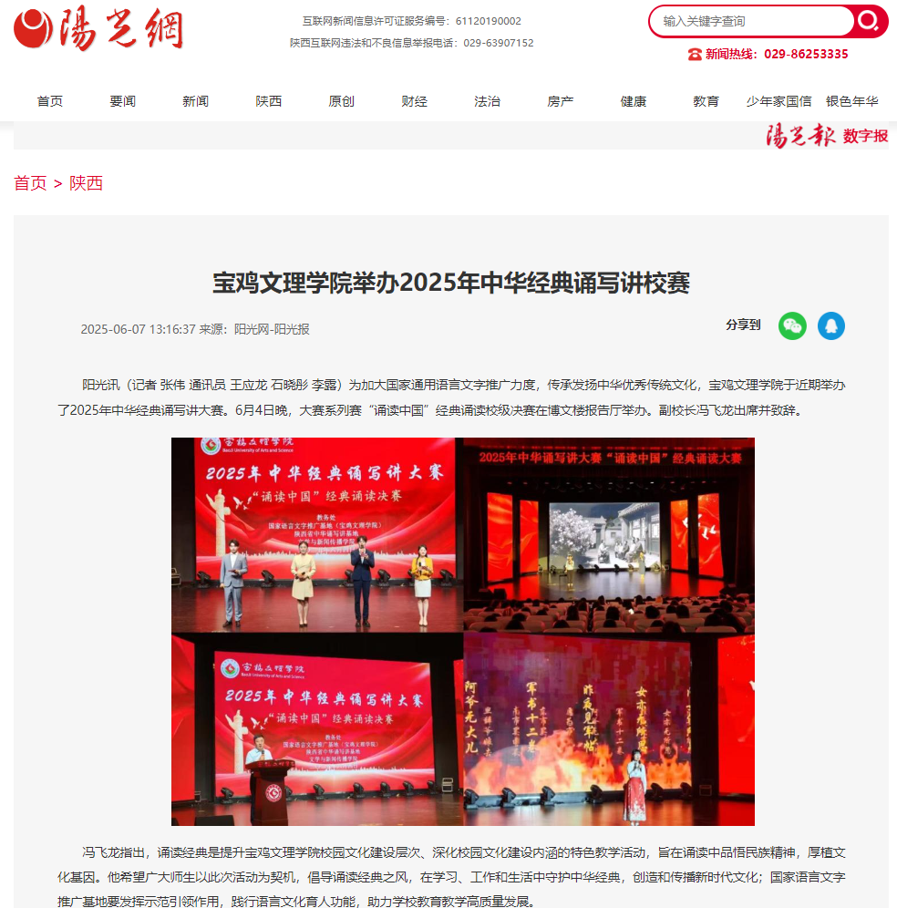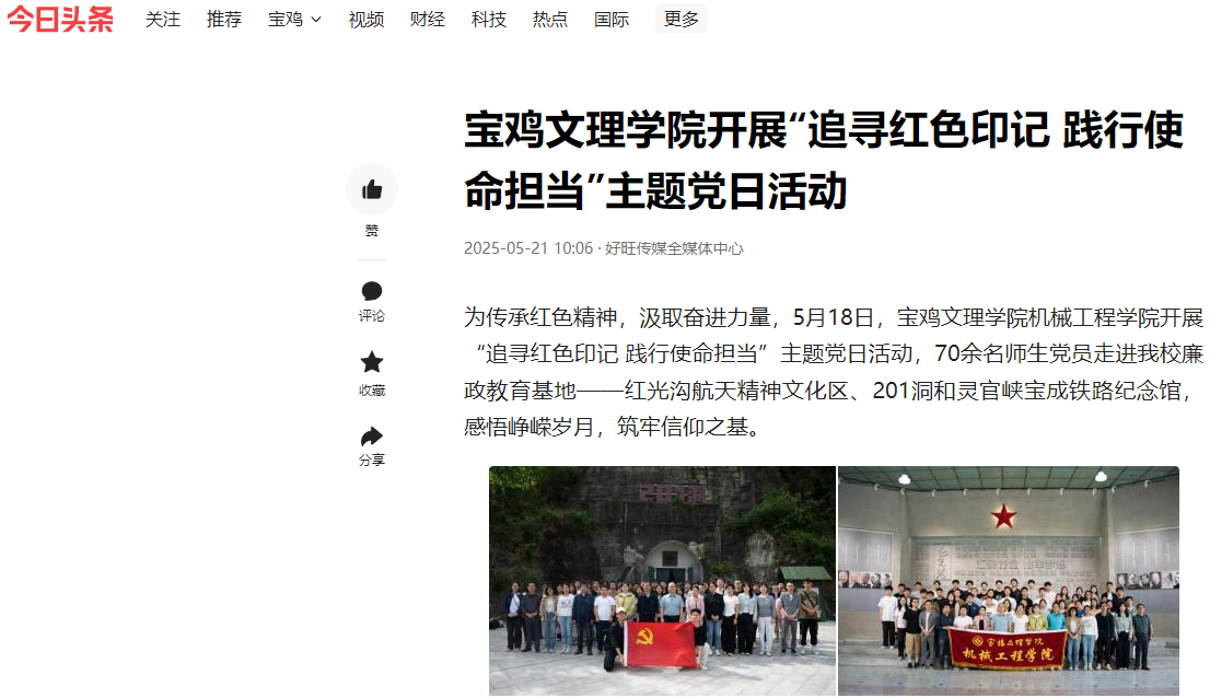 近日,beat365廉政教育基地揭牌仪式在张载祠举行、“双百工程”走进桃川镇中心小学、学校两名在校生和一名校友荣膺2025年第一季度“宝鸡好人”、举办“非遗进校园——千阳刺绣校园艺术展”活动、举办第十五届绿植领养系列活动、举办2025年中华经典诵写讲校赛、著名作家胡宝林为beat365师生作文学创作报告、举办2025年端午佳节粽子发放仪式、机械工程学院开展“追寻红色印记 践行使命担当”主题党日活动、文学与新闻传播学院召开学科建设与科研工作会议、地理与环境学院开展劳动教育宣传与实践等活动引起三秦都市报、陕西农村网、陕西时代网、宝鸡文明网、阳光网、太白融媒、今日头条等多家媒体广泛关注和报道。
