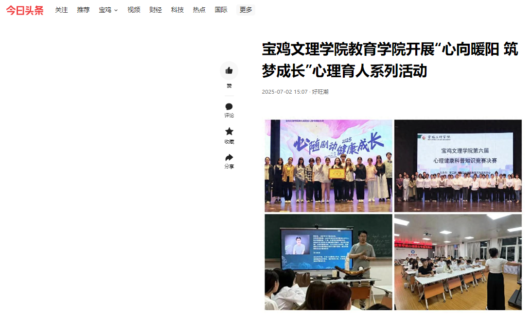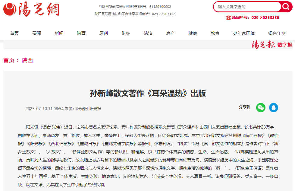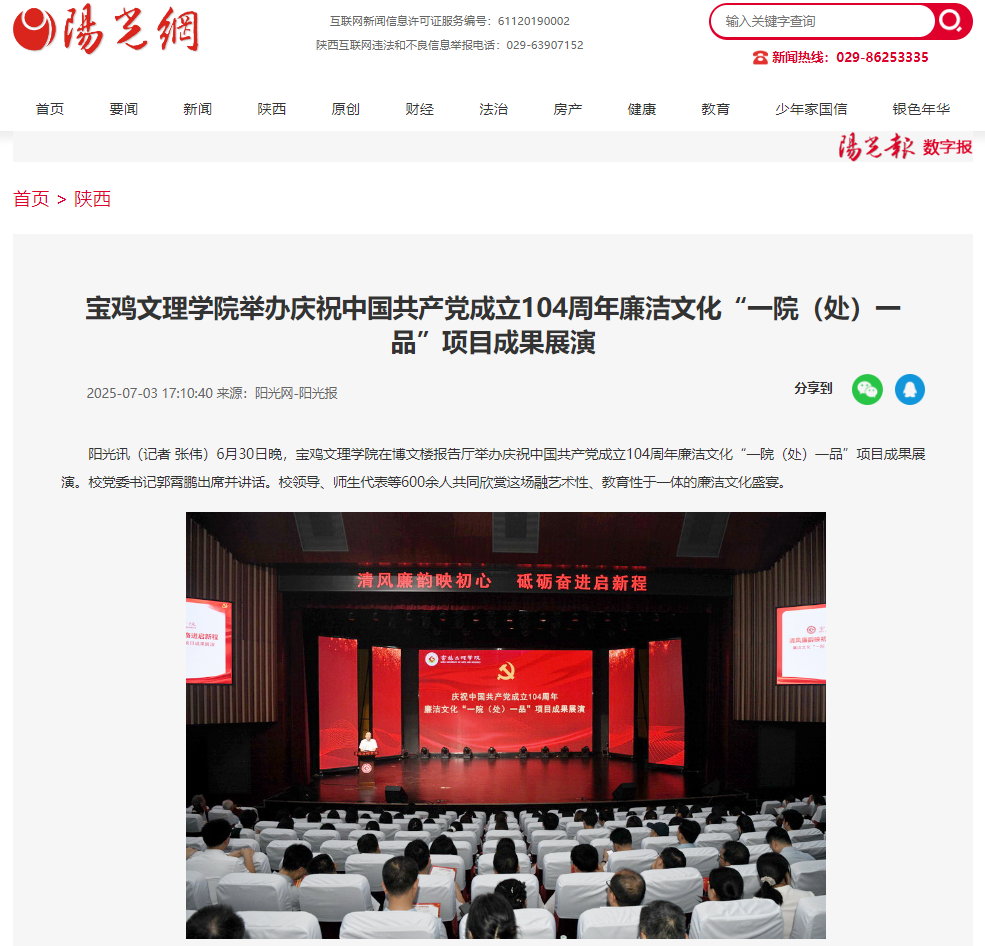 近日,学校举办庆祝中国共产党成立104周年廉洁文化“一院(处)一品”项目成果展演、《陕西日报》刊发beat365师生学术文章、开展暑期“三下乡”社会实践活动、教育学院开展“心向暖阳 筑梦成长”心理育人系列活动、孙新峰教授散文著作《耳朵温热》出版等活动引起学习强国、陕西日报、阳光网、陕西都市新闻、陕西晨报、宝鸡市融媒体中心、今日头条等多家媒体广泛关注和报道。