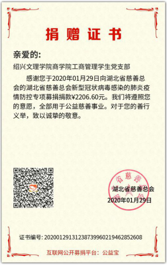 学院各党支部也积极响应上级党委号召,充分发挥基层党组织战斗堡垒作用和共产党员先锋模范作用,不忘初心、牢记使命,主动担当作为,在做好疫情防控工作的同时,伸出援助之手,倡议师生党员进行捐款,据不完全统计,截止目前已分别向武汉市慈善总会、武汉市红十字会等机构累计捐款超过12000元,为坚决打赢新型冠状病毒感染疫情防控阻击战贡献力量,同时师生捐款还在陆续进行中。