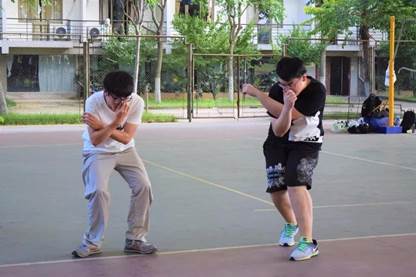 花样接力分为五个部分。五个部分分别为:原地大象鼻子转十圈;指压板上光脚跳绳,一次性10个;喝下一杯柠檬汁后摆出一个灿烂的微笑;运球跨全场上篮,一定要进球;抱着篮球大象鼻子15圈,然后将球投进篮筐。不得不说在指压板上跳绳和最后的十五圈转圈真的令人害怕呢,但每个队员都很好地完成了自己的任务,师生关系也变得越来越亲密。