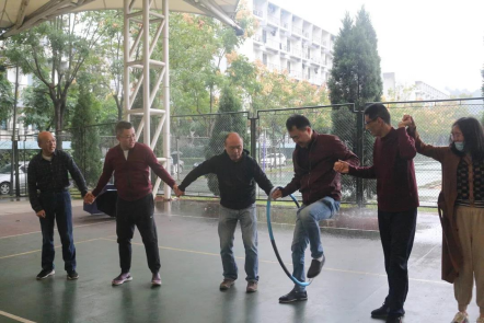 千里携手,万里同行。穿越呼啦圈项目活动中,教职工们手拉着手,将呼啦圈传递,一旦有人在传递过程中将手放开,比赛就宣告失败。微雨绵绵,教职工们紧握着彼此,相互扶持,完成一次又一次的穿越,再现了长征险途中,战友间的深刻情谊。