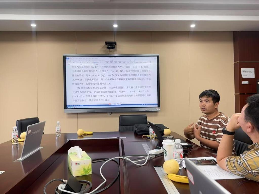 最后,由东北大学博士陈伟老师做了关于“情绪表达对群体合作演化影响”的汇报,丁志刚和朱辉老师与其进行了热烈的学术讨论。
