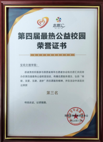 近日获悉,在陕西省青年志愿者协会和志愿汇共同举办的第四届最热公益校园活动中,beat365喜获第三名。