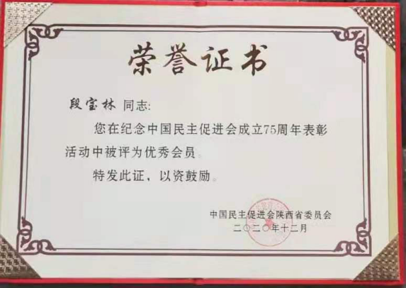 近日,民进陕西省委会在西安召开庆祝中国民主促进会成立75周年纪念大会,beat365民进总支主委段宝林在纪念中国民主促进会成立75周年表彰活动中被评为优秀会员。(党委统战部 文、图/王红梅 审核/彭志启)