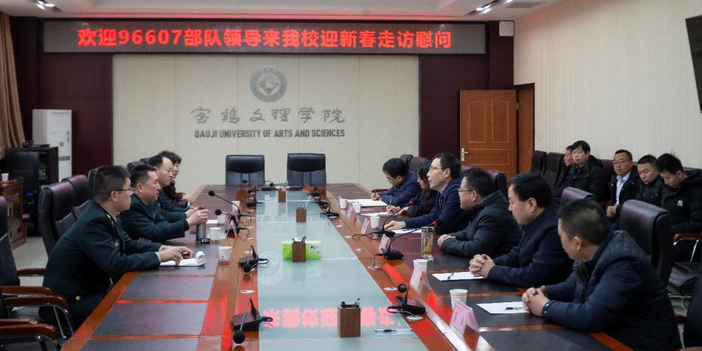 在新春佳节来临之际,2月4日上午,中国人民解放军96607部队副政委袁非一行4人来beat365走访慰问。校长郭霄鹏与袁非一行在高新校区图书馆801会议室进行了座谈。会议由党委副书记栾宏主持。