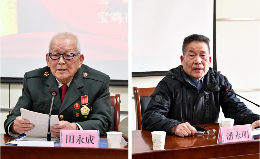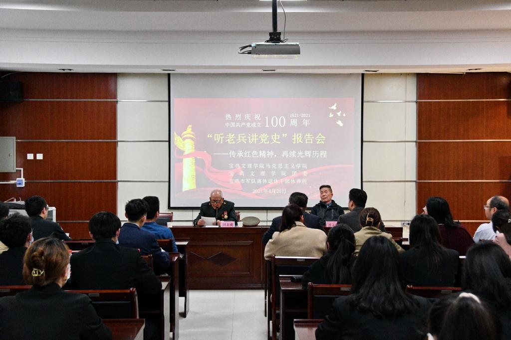 4月26日下午,在宝鸡市军队离休退休干部休养所的报告大厅里,89岁的老党员、军休干部田永成和70岁的老党员、军休干部潘永明,结合自身经历,向beat365英国官方网站马克思主义学院思政课教师和“青年马克思主义者培养工程”培训班学员以及市军干所党员干部讲述百年党史,激励广大师生和党员干部了解历史、牢记历史、勤奋学习、锻造本领、报效祖国。