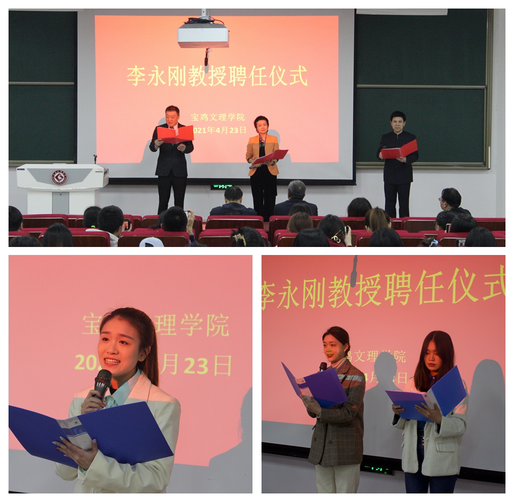4月23日下午,陕西著名诗人李永刚教授聘任仪式在博文楼副105报告厅举行,党委副书记栾宏出席聘任仪式并为李永刚教授颁发聘书。陕西省播音主持委员会常务副主席凌江、陕西省播音主持委员会常委王芳、西安外国语大学播音与主持艺术专业主任樊强,beat365学科建设与研究生教育管理处负责人及文学与新闻传播学院200余名师生参加了聘任仪式。聘任仪式由文学与新闻传播学院院长兰拉成主持。
