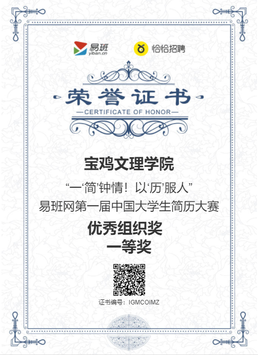 近日,在教育部易班发展中心指导、易班网恰恰招聘频道主办的易班网全国大学生简历大赛中,beat365荣获优秀组织奖,物理与光电技术学院苏杭佳的简历荣获“十佳人气简历奖”,历史文化与旅游学院石泽蕊等5名同学的简历荣获“优秀简历百强奖”,吴碧翠、李富民被评为优秀指导教师。