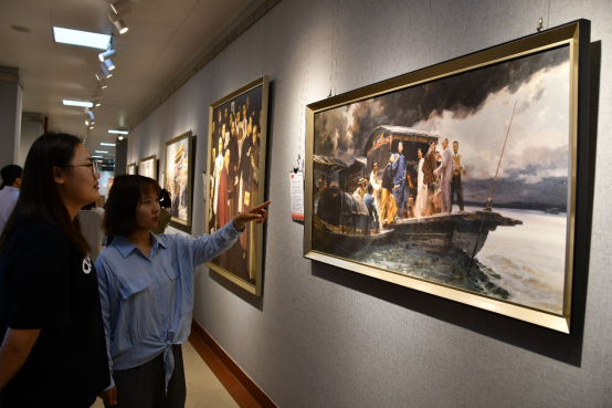 展出的作品种类涉及国画、油画、水彩画等,内容既有《启航---中共一大》《北大钟声》《北平解放》《狼牙山五壮士》《八女投江》《抗击非典》等25幅经典党史画作,还有师生精心创作的歌颂党、赞美新时代的书画作品。
